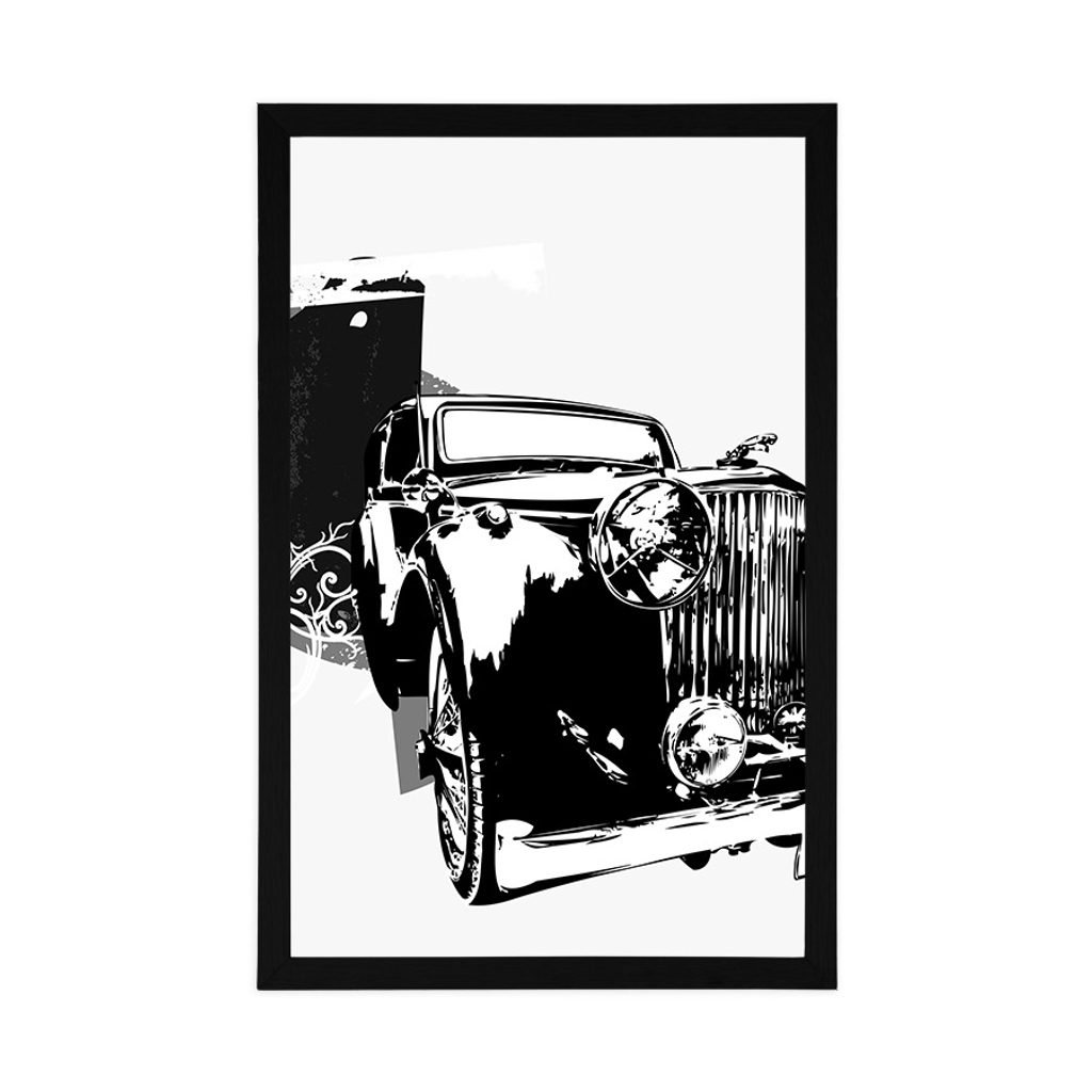 PLAGÁT S PASPARTOU ČIERNOBIELE RETRO AUTO S ABSTRAKCIOU - ČIERNOBIELE - PLAGÁTY