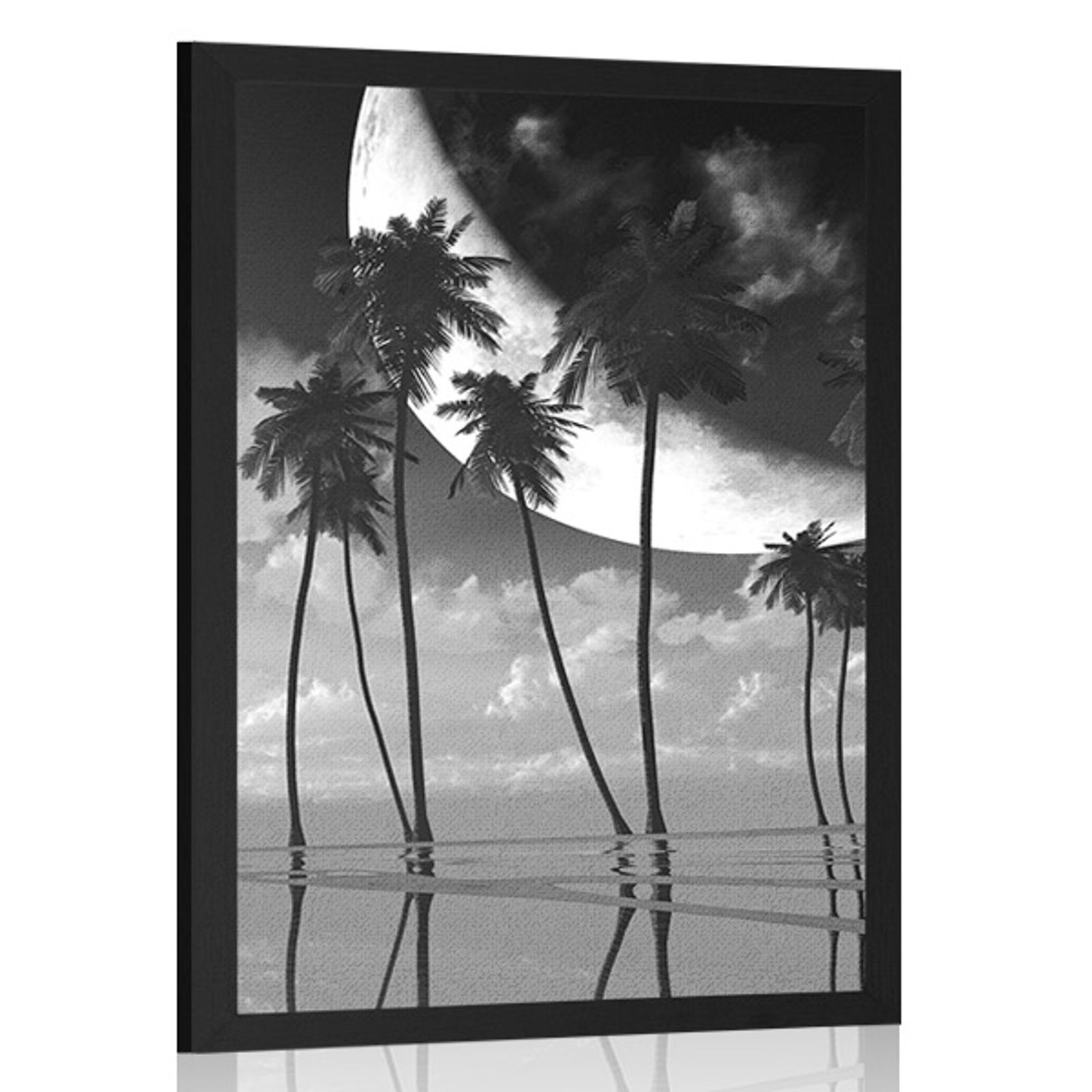 Plagát západ slnka nad tropickými palmami v čiernobielom prevedení