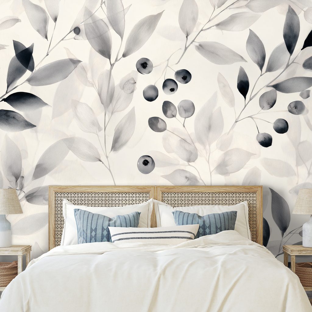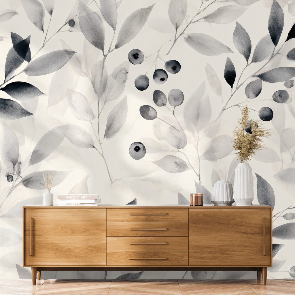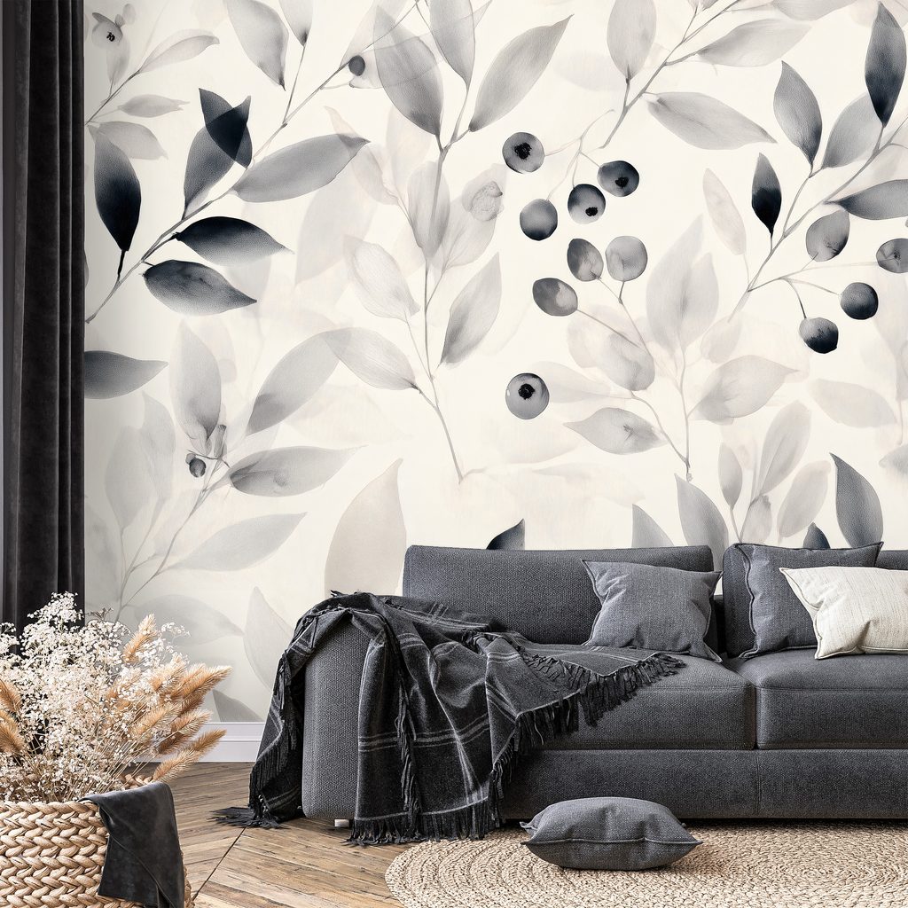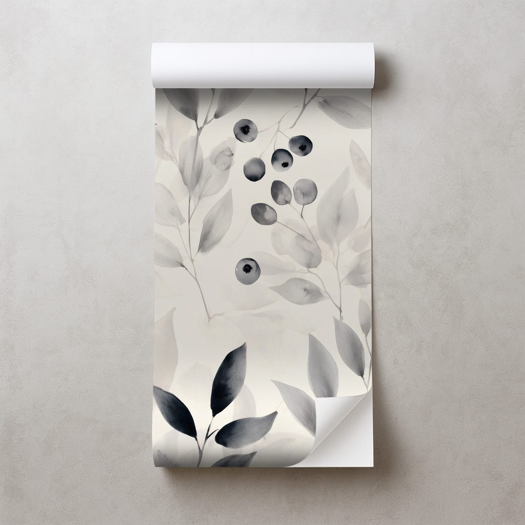 Samolepiaca tapeta čiernobiele akvarelové listy a bobule