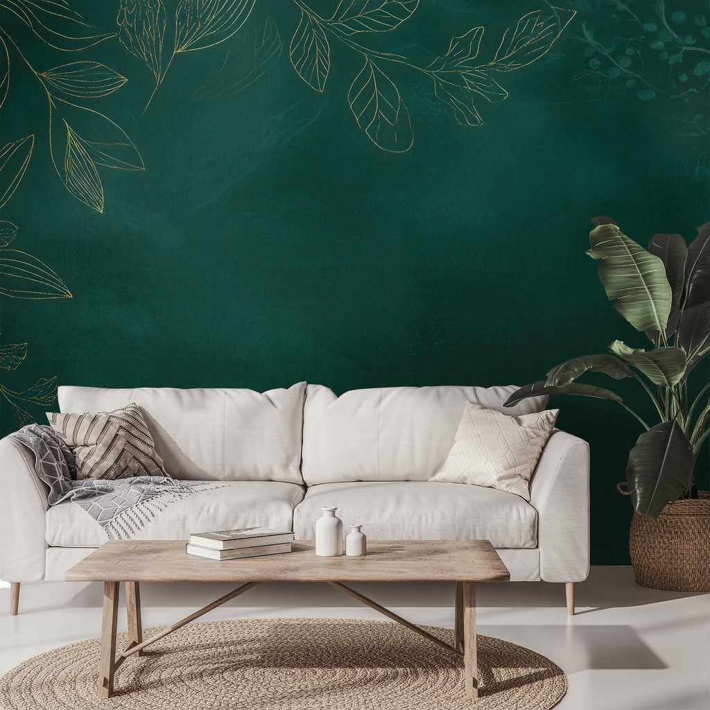 Samolepiaca tapeta zlaté listy na smaragdovo zelenej