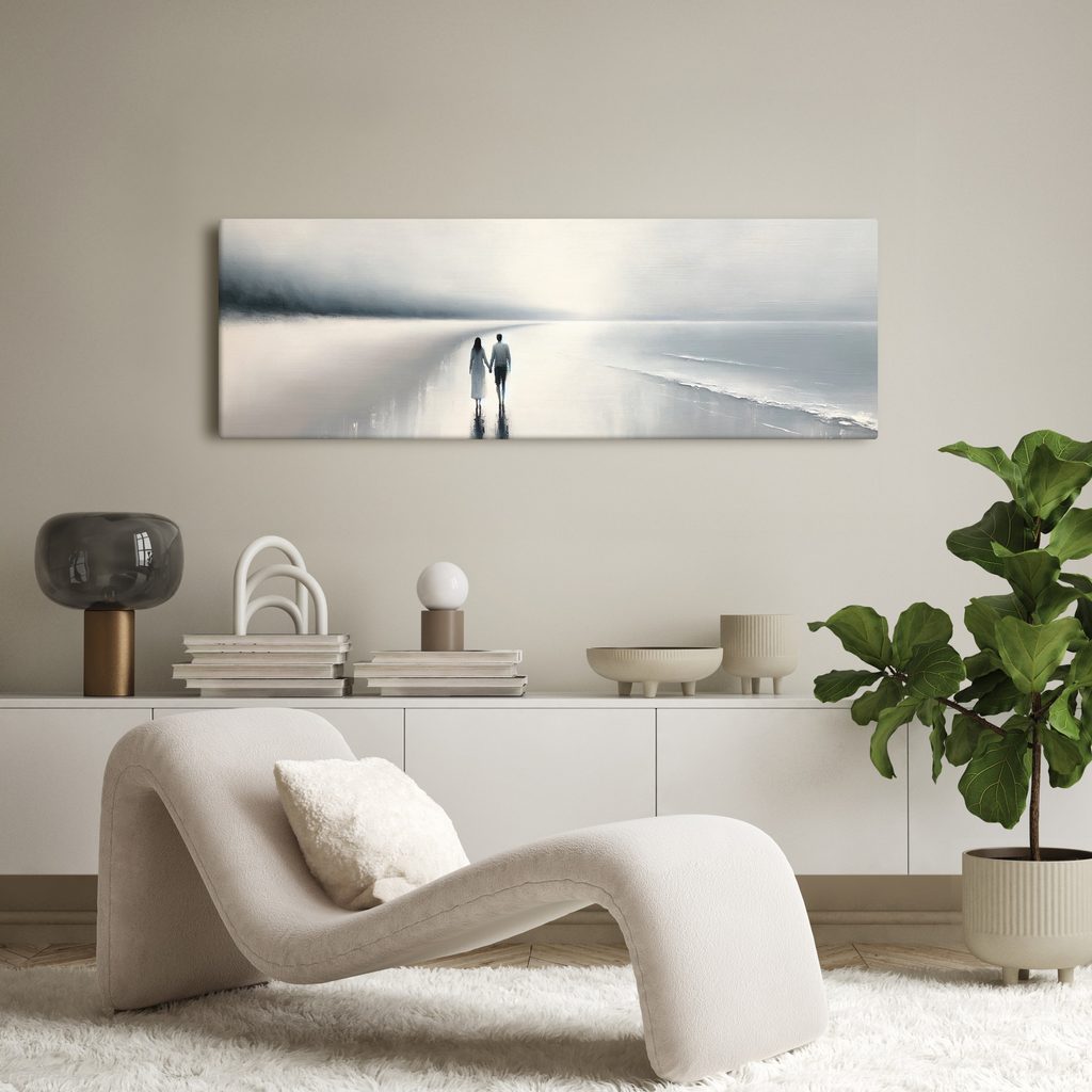 Obraz zachytávajúci romantickú chvíľu dvoch postáv kráčajúcich ruku v ruke po pokojnej pláži. Jemné detaily ako jemné vlnky a hmlistý obzor vytvárajú atmosféru pokoja a pohody. Farebná paleta v odtieňoch sivej a bielej prispieva k melancholickému, ale zároveň romantickému pocitu. Tento obraz je ideálny na zútulnenie vášho domova alebo ako darček pre milovníkov umenia. Obraz je vytlačený na kvalitnom plátne, ktoré zabezpečuje dlhú životnosť a pôsobivý vzhľad.